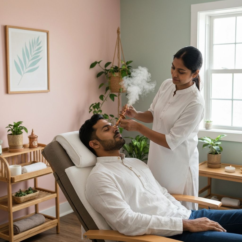 Nasya is the therapeutic administration of medicated oils, powders, or herbal preparations through the nasal passages. This treatment clears the head region, improves mental clarity, and is highly effective for respiratory, sensory, and mental health issues.